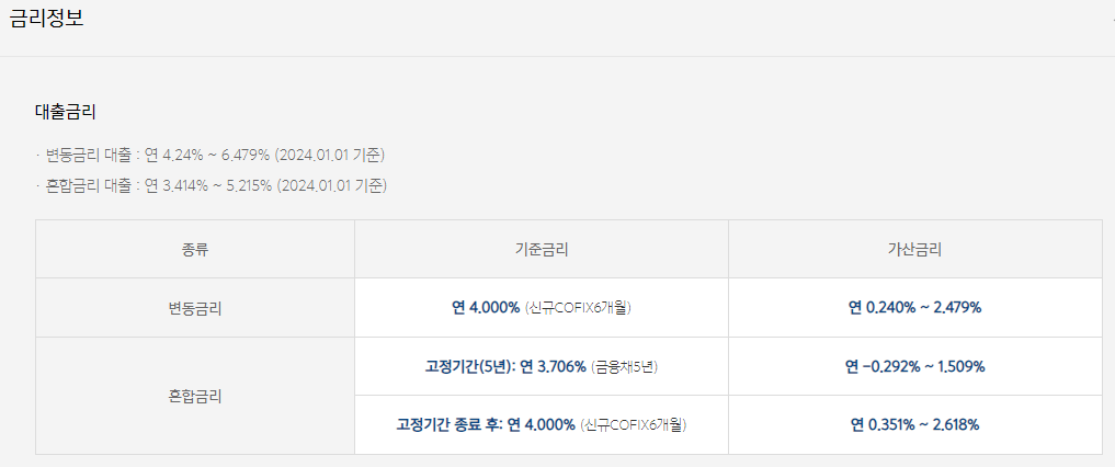 - 대출 금리: 변동금리와 혼합금리 중 선택할 수 있으며, 2023년 5월 기준으로 변동금리는 연 4.048% - 6.268%, 혼합금리는 연 4.558% - 6.758%입니다.